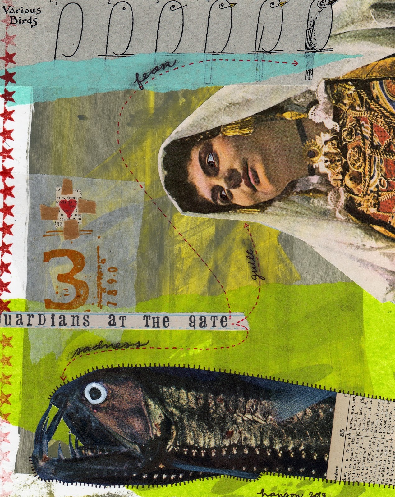 I really haven't used these collages to work through personal challenges. This one came out of the blue at me. Was stranded for several days by fear, unable to move past it. Then I remembered Pema Chodron & her discussion of the Guardians at the Gate who are very ancient, created by me as child for protection; they have good intentions, but since they were invented by a child they are no longer productive protectors. They are still powerful & I must give them their due. As soon as I acknowledged their presence they evaporated away. I no longer felt stranded. Its so interesting to me. And even though the Guardians are sort of destructive I love them so.